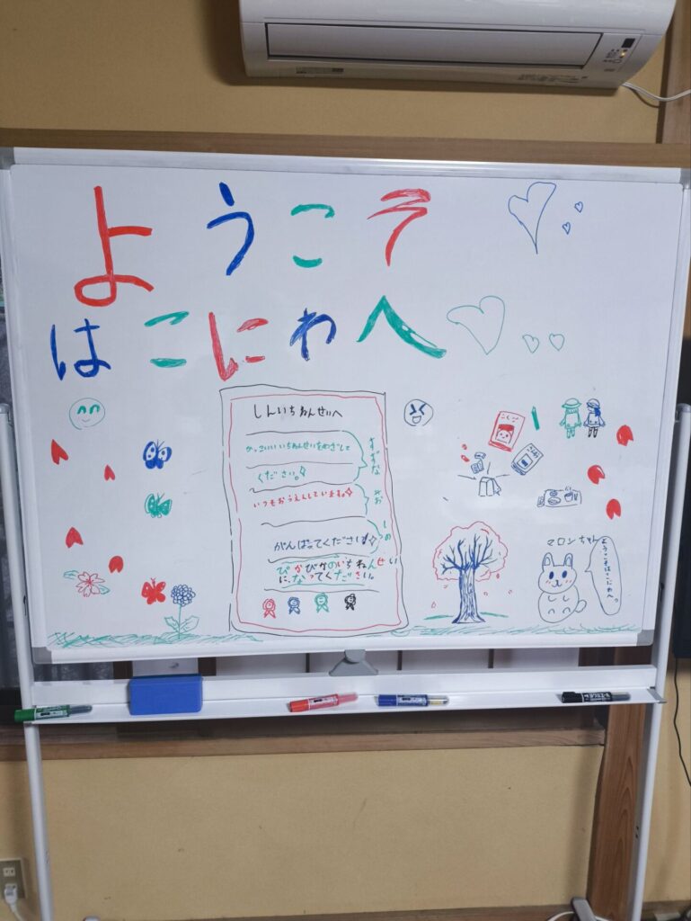 「新1年生にメッセージを書こう!」と、ホワイトボードにたくさんの言葉や絵を書いてくれました✨